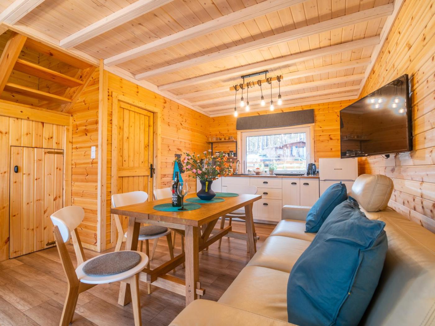 Domek z 2 sypialniami. This chalet features a fireplace. Featuring 2 bedrooms and 1 bathroom, this chalet offers a living room and terraceyou can relax. The chalets kitchenette, which features kitchenware, is available for cooking and storing food. Boasting a balcony with lake views, this chalet also provides a barbecue and a flat-screen TV. The unit has 5 beds. Domek - 6 osobowy. Powierzchnia pokoju ok.: 70 mkw.