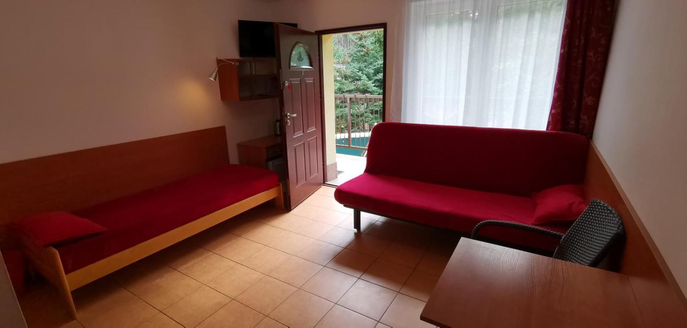 Studio typu Standard. The studio provides a dining area, a wardrobe, as well as a private bathroom featuring a shower. A kitchenette fitted with a refrigerator, kitchenware and a microwave is available for cooking and storing food. Boasting an outdoor dining area, this studio also features a private entrance, a tea and coffee maker and a flat-screen TV with cable channels. The unit has 4 beds. Studio - 5 osobowy. Powierzchnia pokoju ok.: 29 mkw. ;